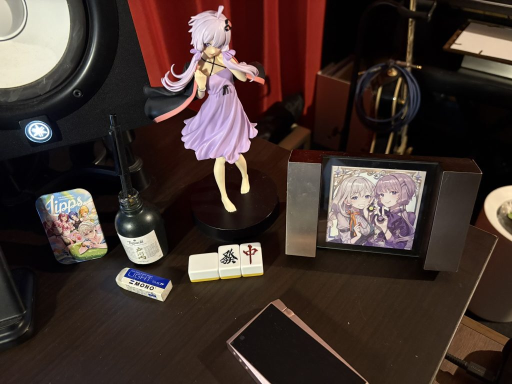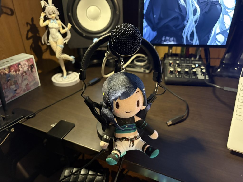 YAMAHAのマイクが置いてあります。軽く声を録りたいときに使えるし、ボイスチャットにも使えます。ついでにヘッドフォンもかけて、杏ちゃんも引っ掛ける。
