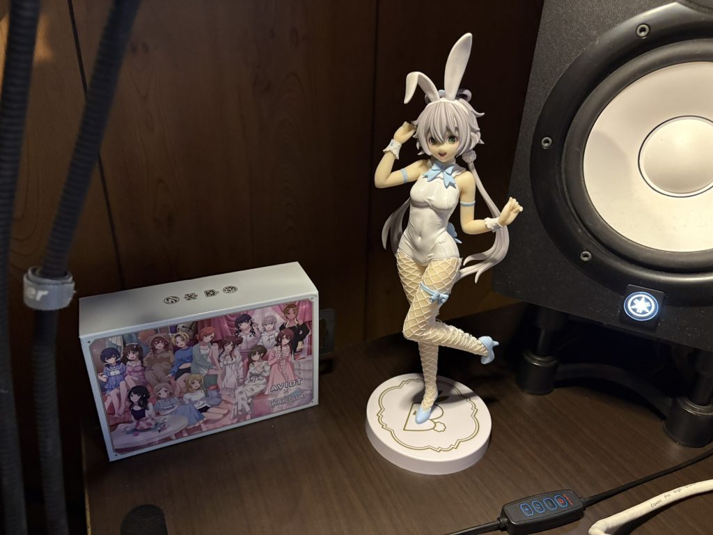 ちらっと写っていますが、これベッドの下です。階段で上がって上で寝てる。4畳半だとこうでもしないと大きいデスク置けないんですよね。プライズフィギュアだらけですね。フィギュア自体に執着はなくって、フィギュアを購入することは無いんですが、キャッチャーマシン、ゲーセンと勝負してる感じがして好きなんですよね。超かわいい副産物です。