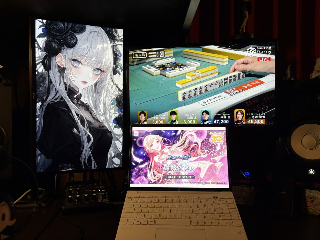 ディスプレイは2枚。作曲時はデスクトップPCなのでデュアル。ノートPC接続時はPCとあわせてトリプルディスプレイになります。麻雀観てますねこいつ。