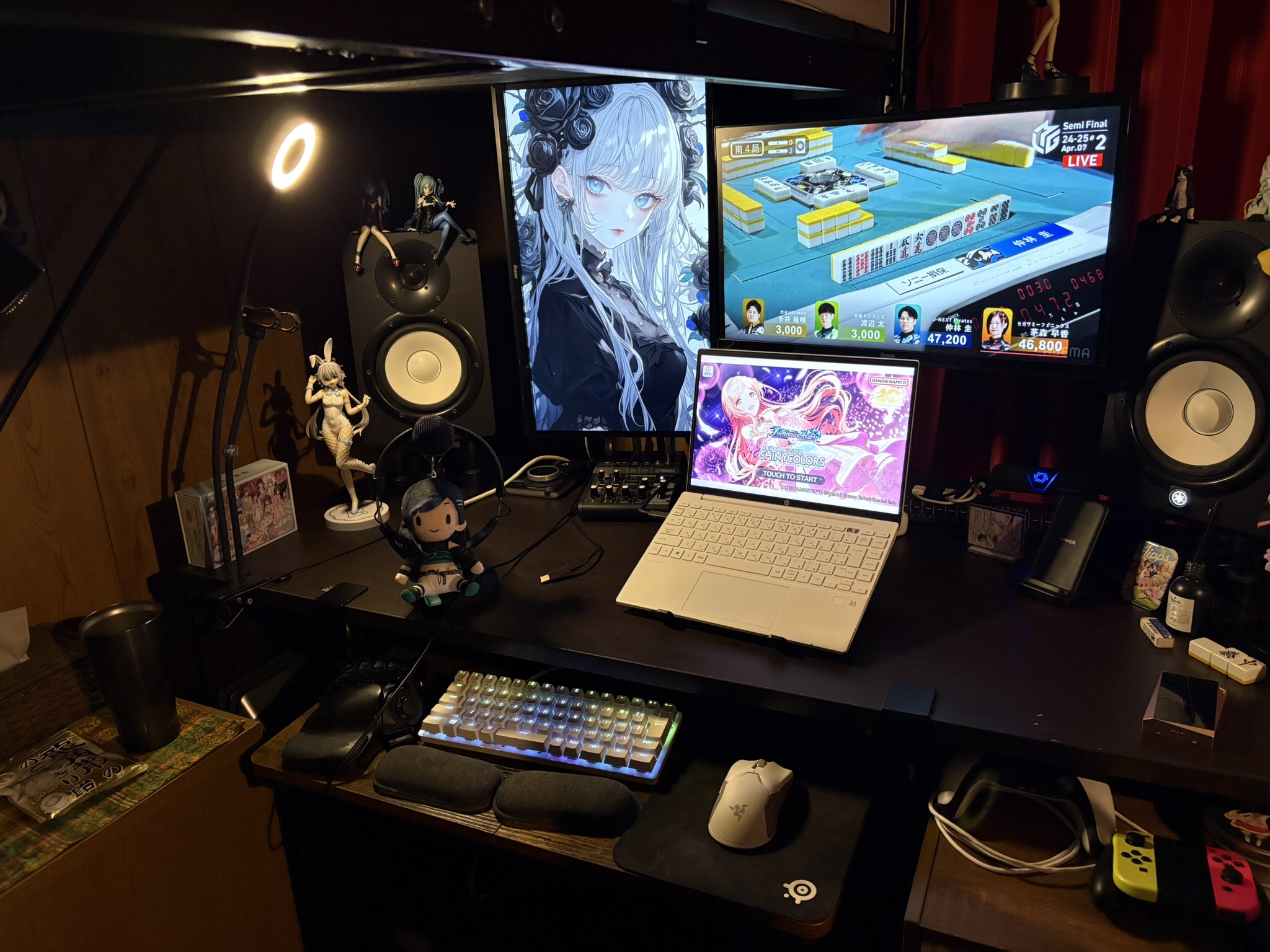 ディスプレイは2枚。作曲時はデスクトップPCなのでデュアル。ノートPC接続時はPCとあわせてトリプルディスプレイになります。麻雀観てますねこいつ。