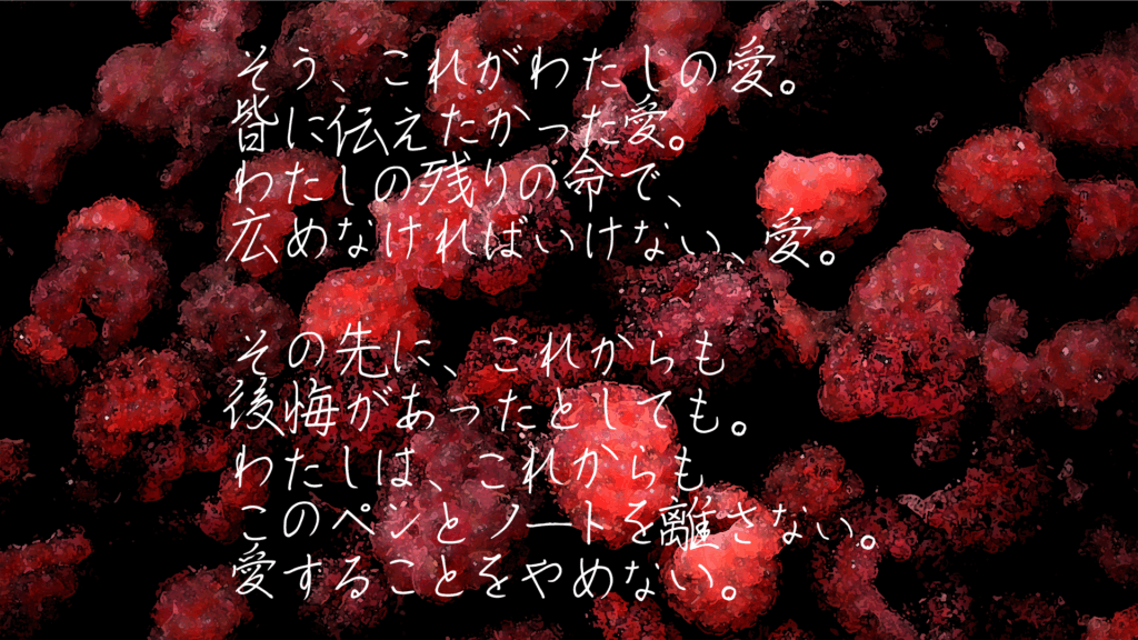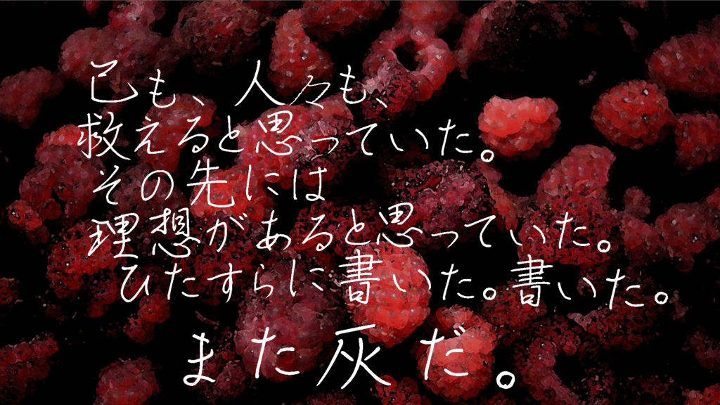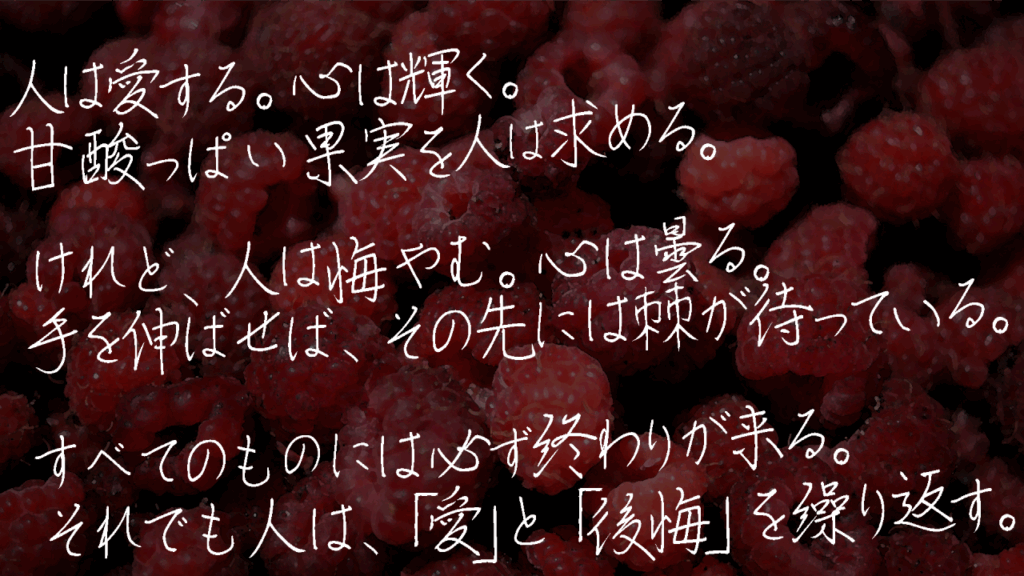 「愛と後悔を語るためには、人はどのくらいの苦心が必要なのか」をテーマにしようと……思いますが、このテーマは後に大きくひっくり返ります。あとから書くね。