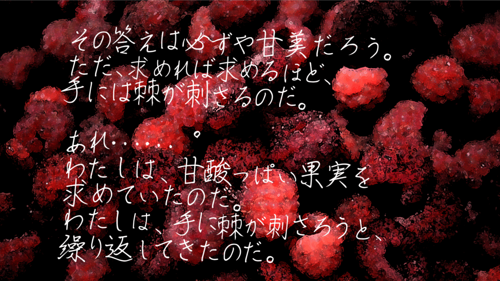 答えが出ないことがあまりにも苦しく、傷だらけになりそうだという心情を示した「リボンに裂かれて飛び散る紅」、