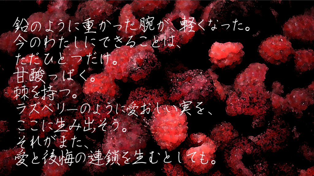 そのあと、彼女の衣装から、真っ先に思いついたのは、「ラズベリー」でした。ラズベリーの花言葉でも調べてみようと思って、調べてみたら「愛」と「後悔」じゃないですか。俺よくわかんねえけどさ、こういうのを哲学って言うんじゃねえのか?